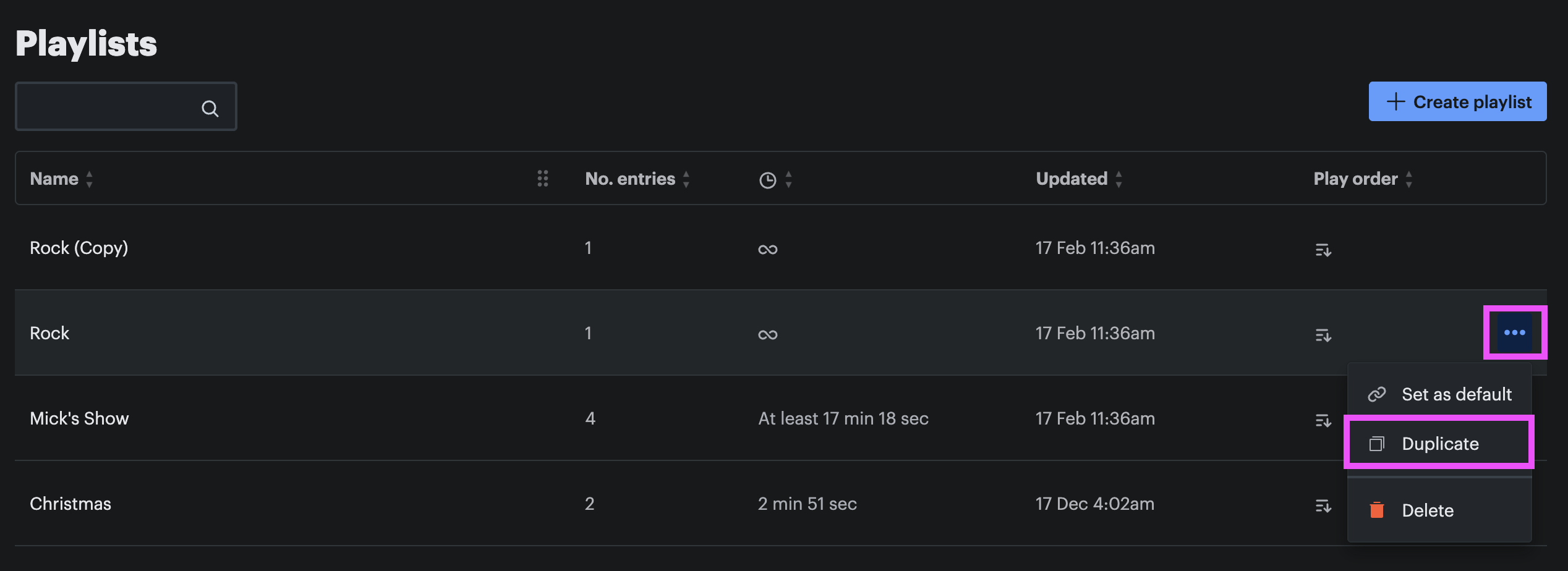 The duplicated playlist will appear in the table with the same name as the original, followed by (Copy).