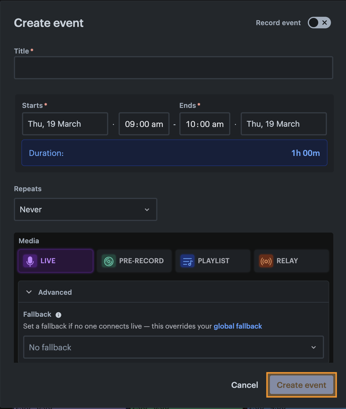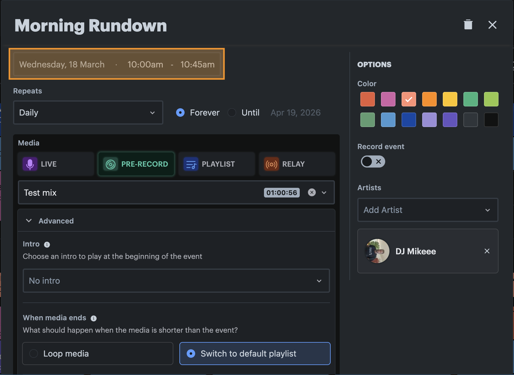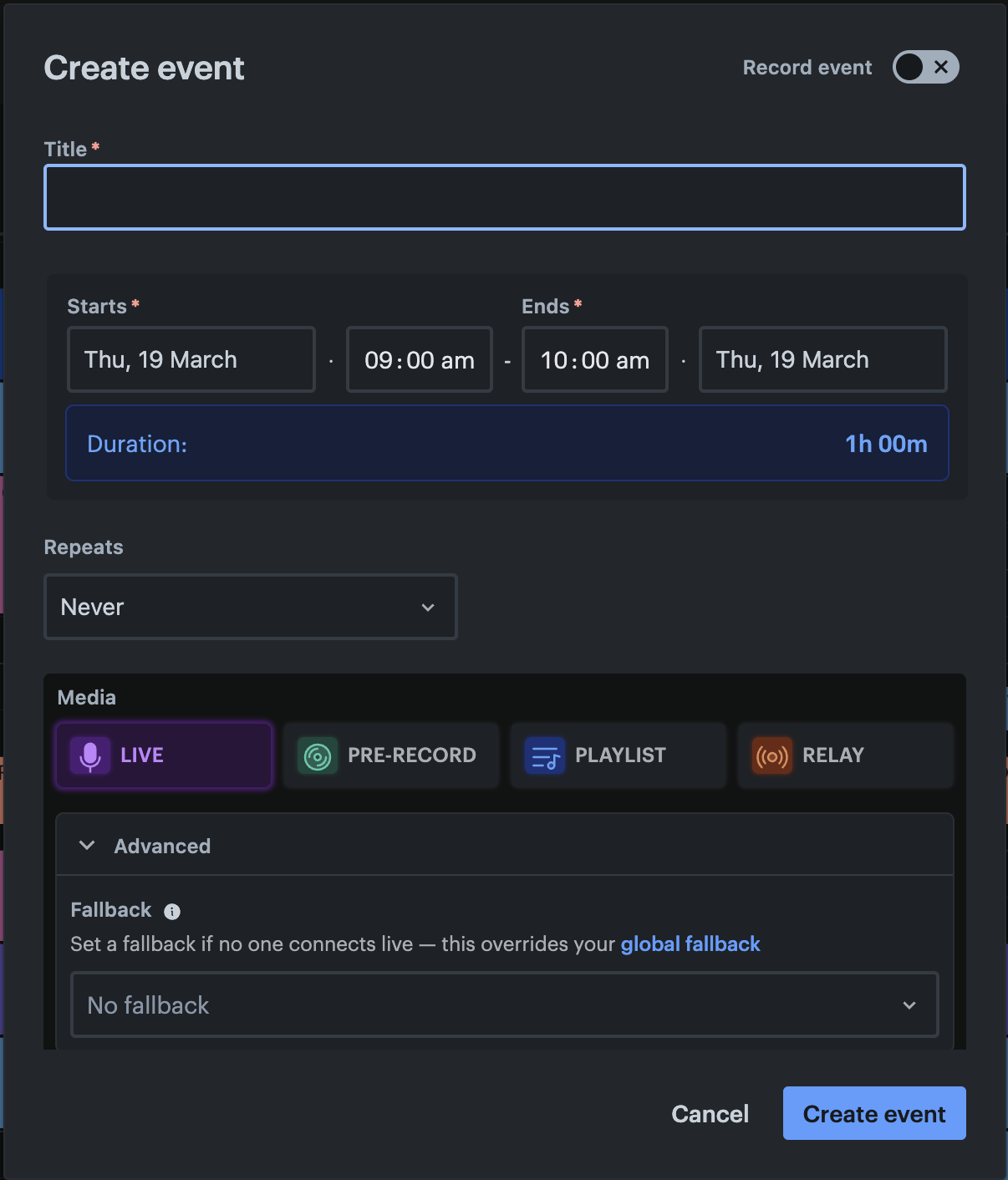 Let's take a look at how to set the duration of an event down to the minute. Time slots default to 15 minutes to make creating events quick and easy. However, all events in Radio Cult can have their duration specified down to the minute.
