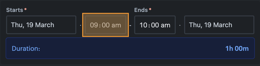 4. Click on any of the time pickers in the Starts and Ends sections to manually enter a time down to the minute. The time pickers function exactly the same as when creating an event, so refer to Steps 4 - 6 in the previous section above to edit the time fields accordingly.