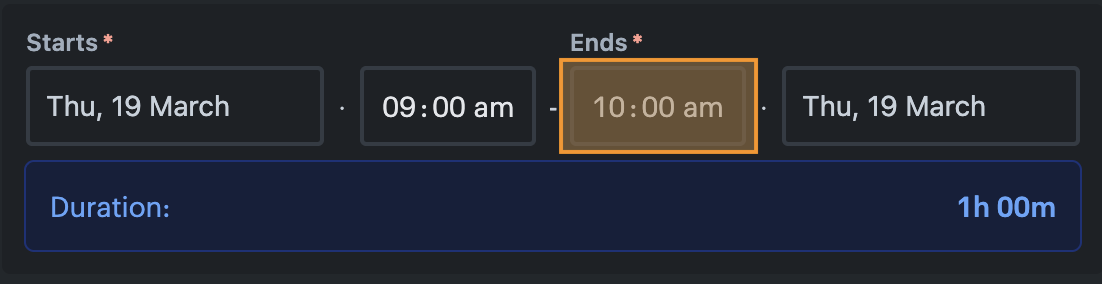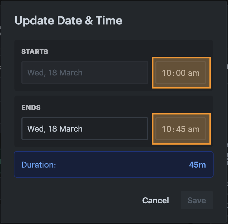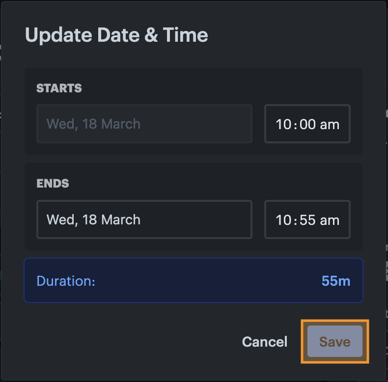 ℹ️ The Duration field in the Update Date & Time modal will update in real time as you edit an event’s start time and/or end time.