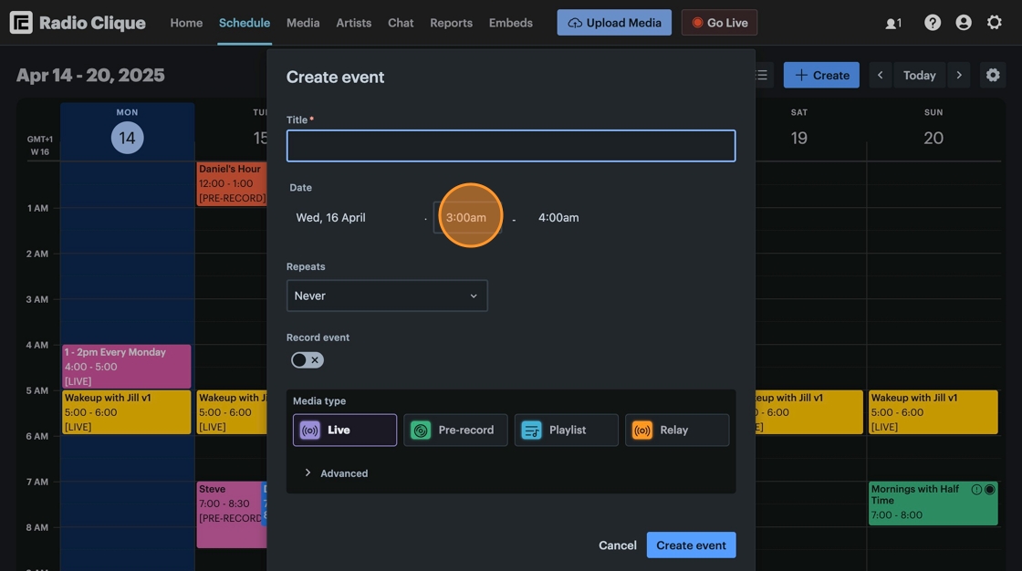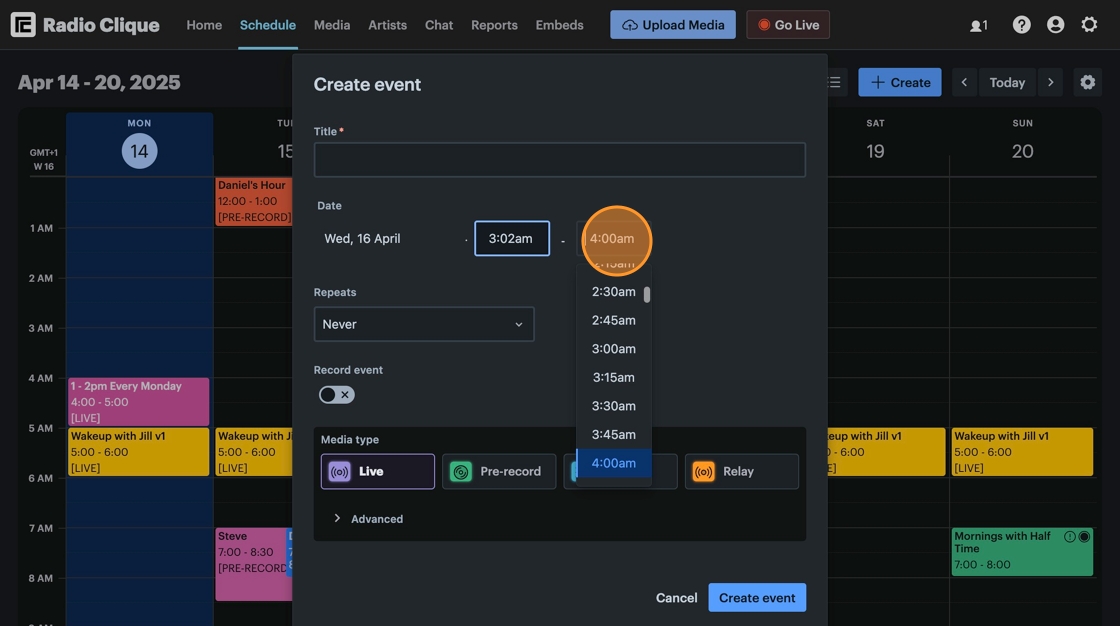 Let's take a look at how to set the duration of an event down to the minute. Time slots default to 15 minutes to make creating simple events quick and easy. However, all events in Radio Cult can have their duration specified down to the minute.