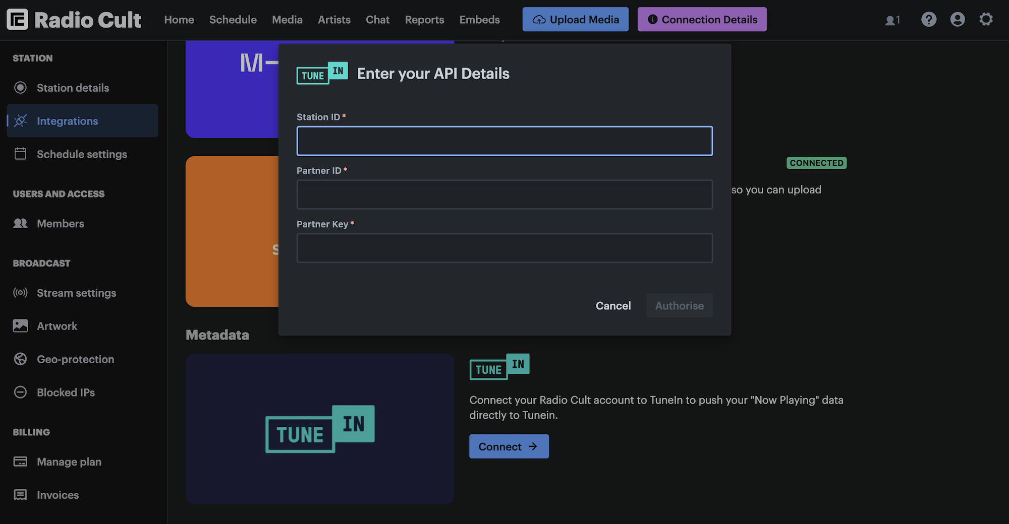 - Click Connect on the TuneIn integration section