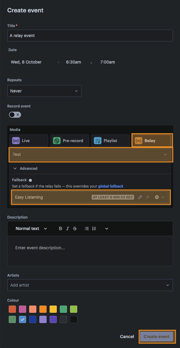 - In the Create event window, click the Relay option for the event’s Media type.