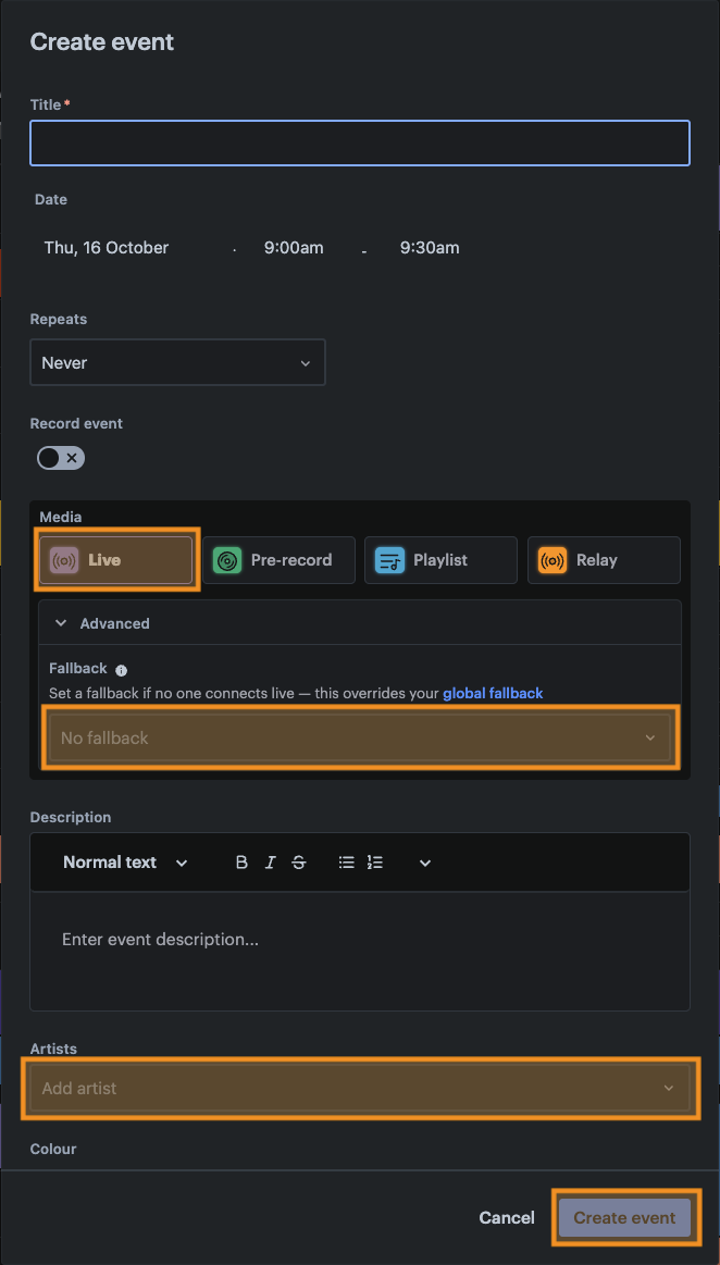 Next, click the Advanced button to reveal the Fallback select. This option allows you to choose a playlist to be broadcast if the selected artist doesn’t connect whilst the live event is active. This ensures your station is still broadcasting something, even when things go wrong. The playlist selected here overrides your station’s global fallback.