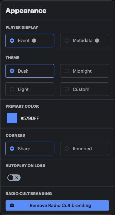 - Remove Radio Cult branding: This option will remove the text: Powered by Radio Cult from your player embed. Note: This option is only available if your Radio Cult plan is premium or business.